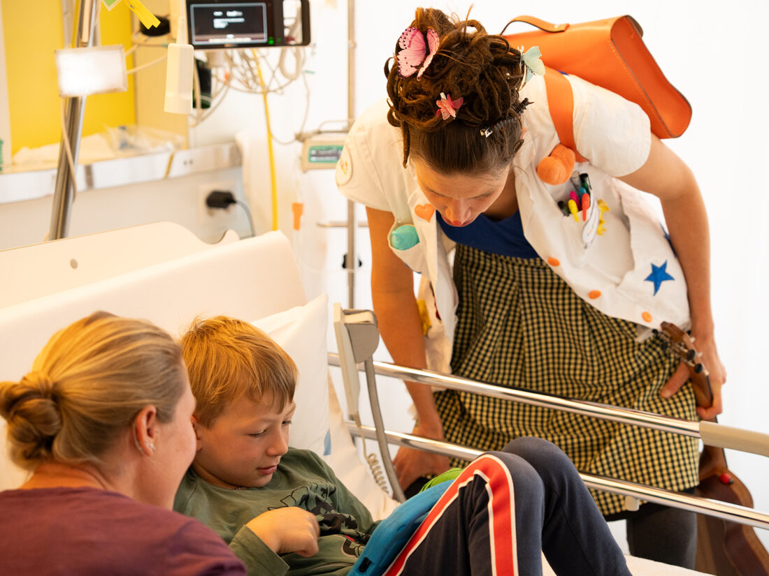 «Dürfen wir reinkommen?» Der Siebenjährige liegt mit einem Gipsarm im Bett, die Mutter sitzt daneben. Ein leises Spiel beginnt – zwischen Anklopfen und «Herein» wünschen –, bis die beiden Traumdoktorinnen den richtigen Eingang finden und kurzerhand durch die Balkontür ins Zimmer treten.
