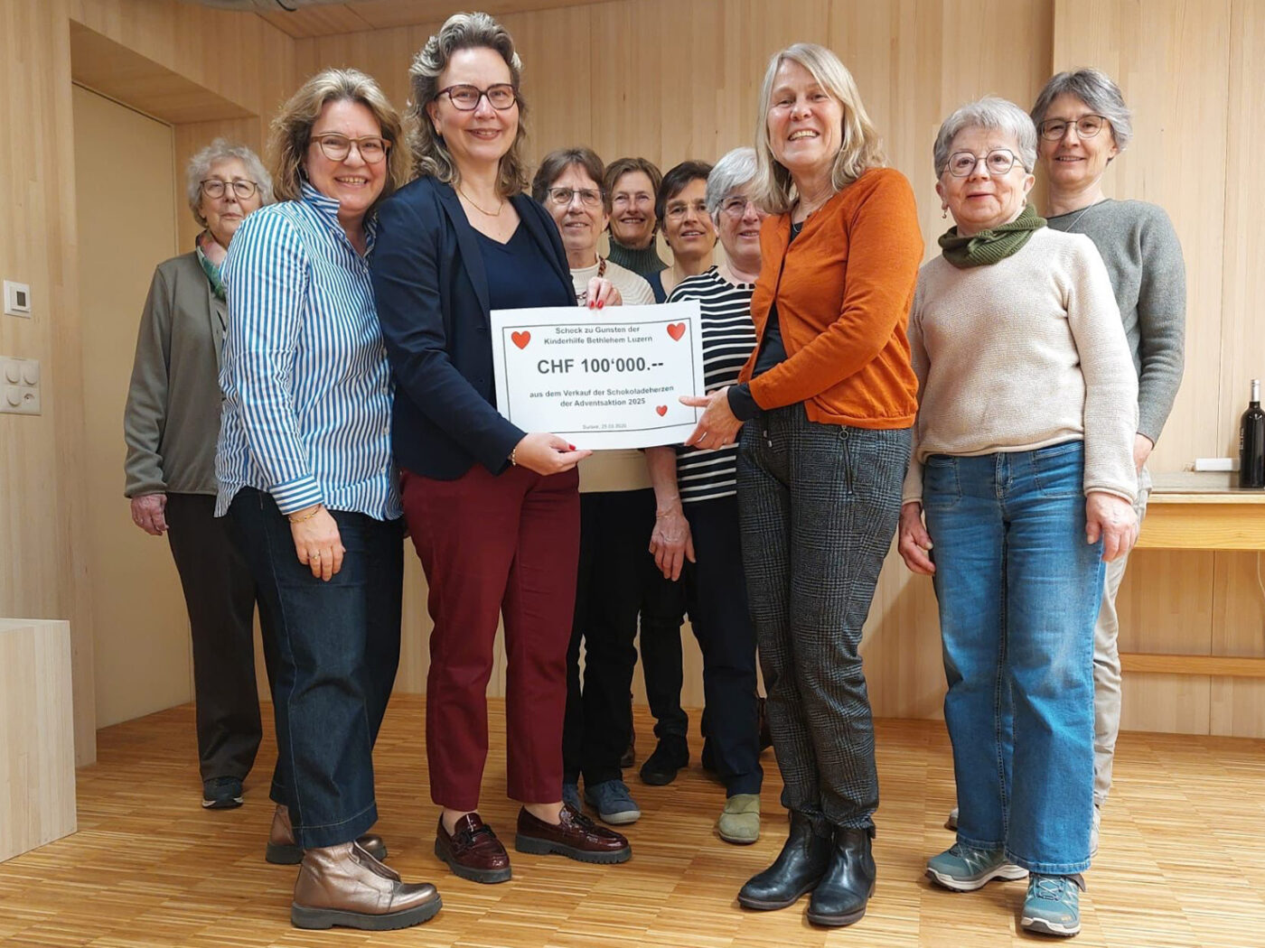 Mit Freude dürfen wir Ihnen mitteilen, dass die Adventsaktion 2025 «Ein Herz für die Kinder von Bethlehem» ein grosser Erfolg war. Der Kinderhilfe Bethlehem – dem Trägerverein des Caritas Baby Hospitals – konnten wir den beachtlichen von Fr. 100'000.00 überweisen, nicht zuletzt auch dank der grossartigen Unterstützung aus der Region Sursee. Einen speziellen Dank richten wir an die Papeterie von Matt AG in Sursee. Zum 20.igsten Mal wurden die Schokoladeherzen an der Kasse zum Verkauf angeboten. Auch danken wir dem Alterszentrum St. Martin und der Jungwacht Sursee herzlich für den Einsatz beim Verkauf.