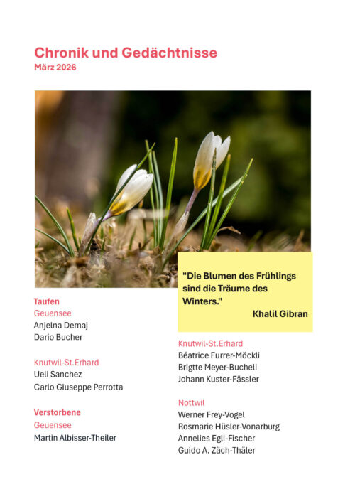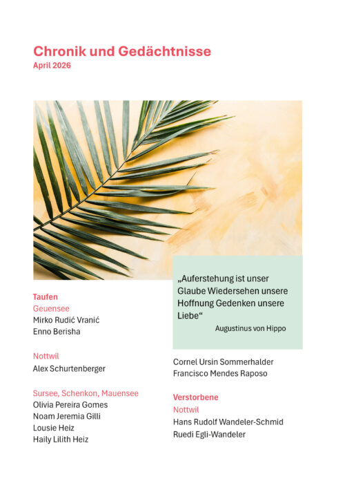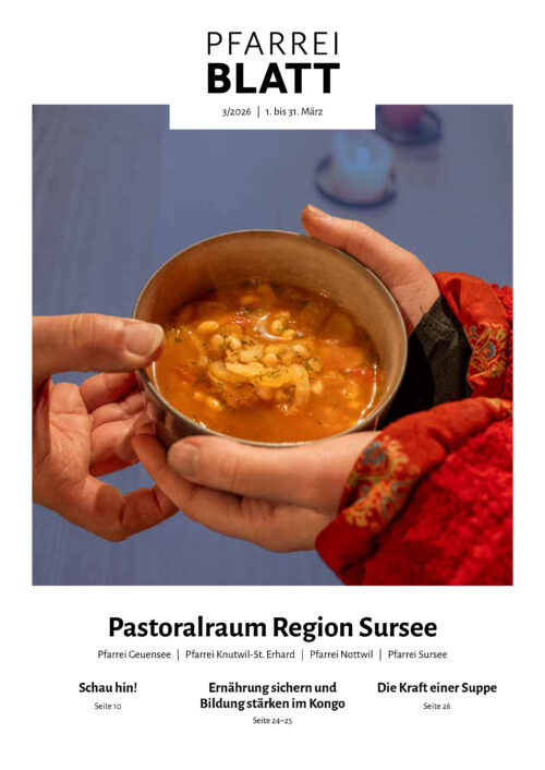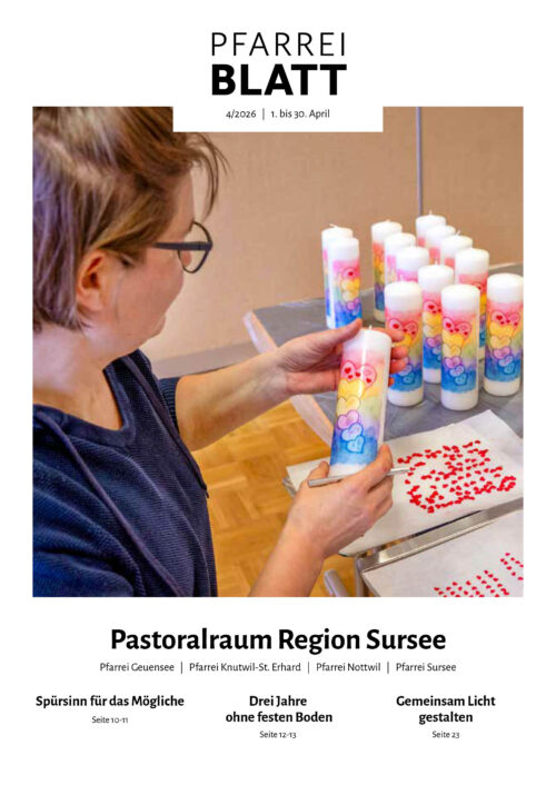 22 Mal im Jahr erhalten Sie mit dem Pfarreiblatt die neuesten Informationen aus der Pfarrei St. Georg und der Kirchgemeinde Sursee. Neben den Gottesdiensten, Anlässen und Vereinsinformationen nimmt das Pfarreiblatt auch Themen rund um die Kirche, den Glauben und das Leben auf. Um Ihnen jeweils ein interessantes und vielseitiges Pfarreiblatt senden zu können, arbeiten wir in einem Team an den Inhalten.