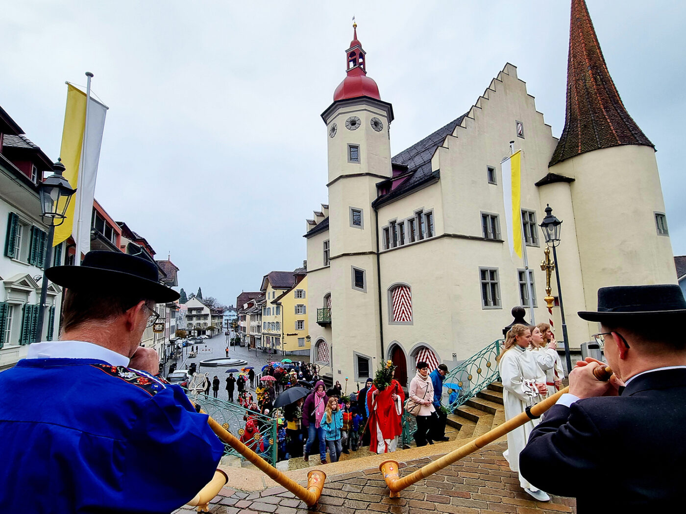 Nach der feierlichen Segnung der Palmbäume und -zweige durch Stephan Stadler bei der Chrüzlikapelle Sursee machten sich die Mitfeiernden in einer Prozession auf den Weg zur Pfarrkirche, wo der Familiengottesdienst zum Palmsonntag stattfand.