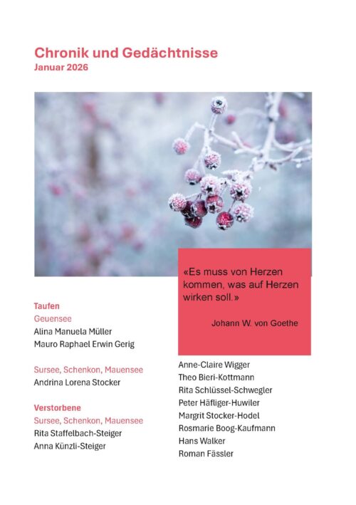 22 Mal im Jahr erhalten Sie mit dem Pfarreiblatt die neuesten Informationen aus der Pfarrei St. Georg und der Kirchgemeinde Sursee. Neben den Gottesdiensten, Anlässen und Vereinsinformationen nimmt das Pfarreiblatt auch Themen rund um die Kirche, den Glauben und das Leben auf. Um Ihnen jeweils ein interessantes und vielseitiges Pfarreiblatt senden zu können, arbeiten wir in einem Team an den Inhalten.